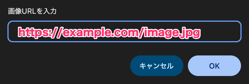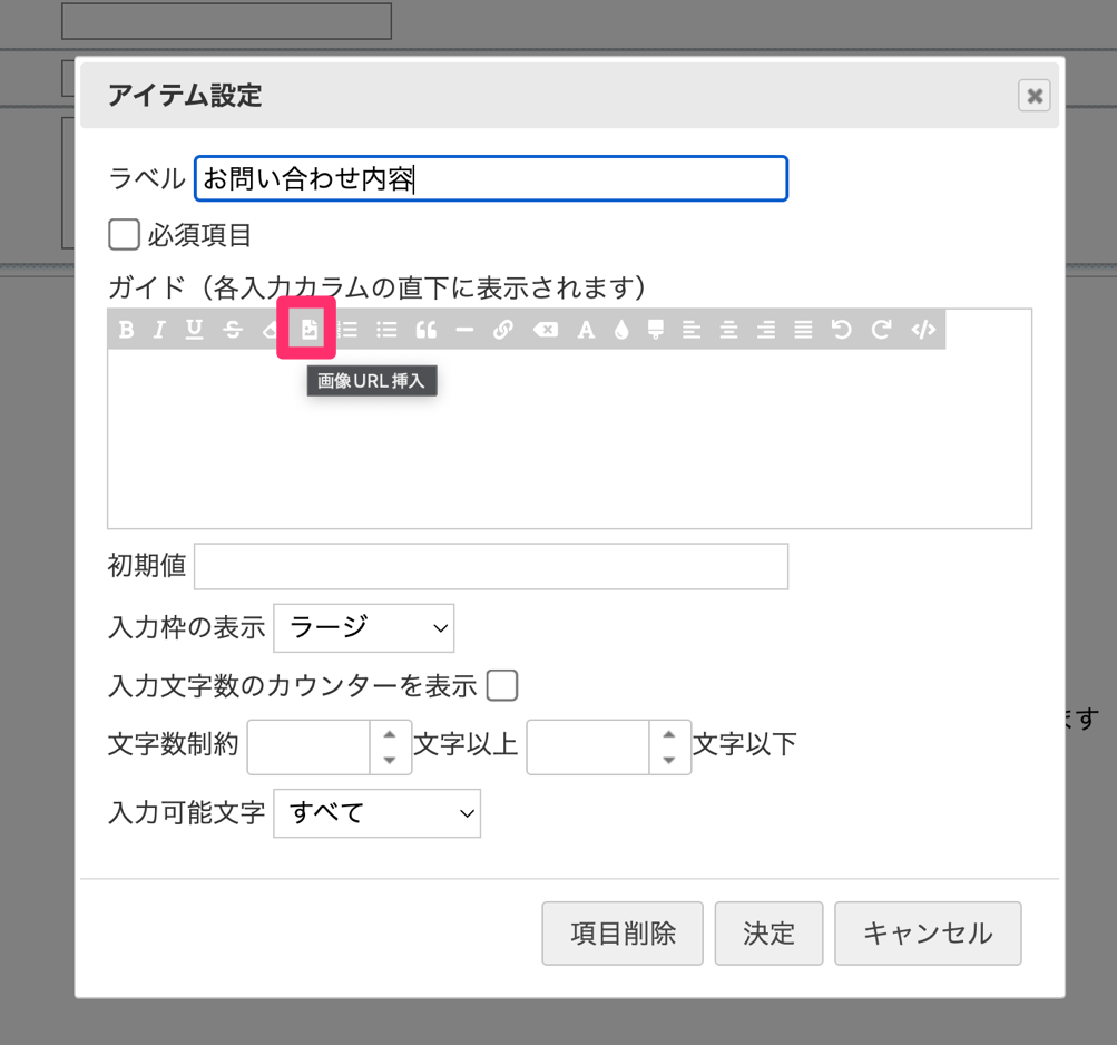 編集ダイアログ内の「ガイド」の下にあるツールバーエリアにある画像URLアイコンをクリックし、コピーしたURLを貼り付けます。